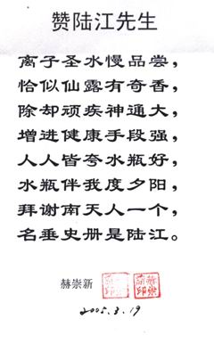3. 詳細(xì)了解請(qǐng)上網(wǎng),可見(jiàn)臨床報(bào)告,鑒定證書(shū)、專家評(píng)說(shuō)、治病機(jī)理、用戶反饋、題詞、詩(shī)歌、錦旗等彩色掃描件,被譽(yù)為"神奇水瓶"。